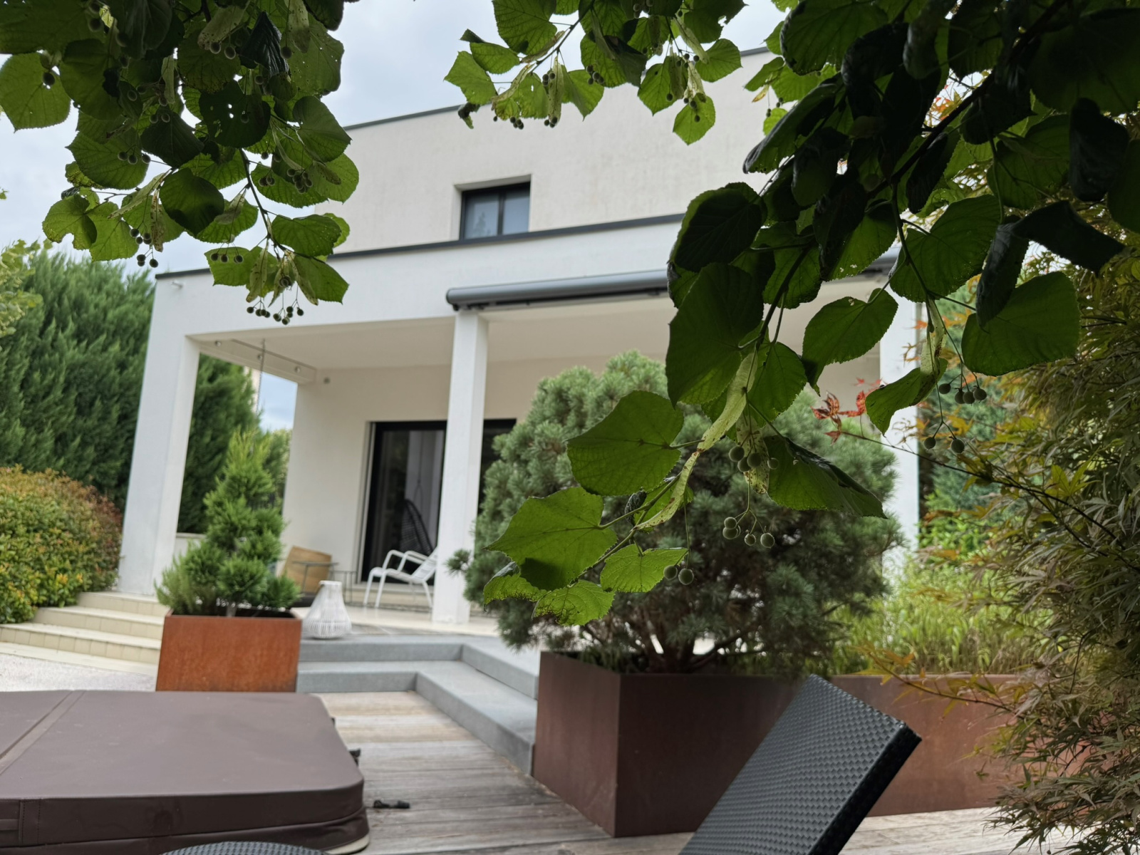 Extérieur soigné, terrasse aménagée et couverte, jacuzzi et jardin paysagé pour profiter pleinement des beaux jours.